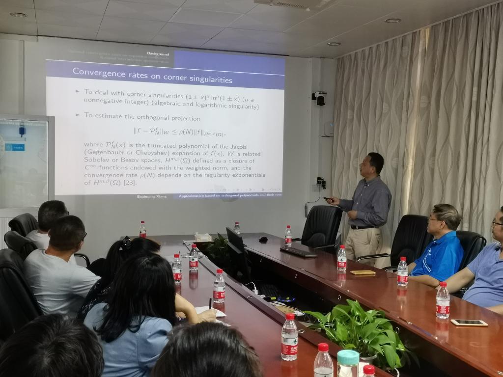 邀请,中南大学向淑晃教授在霞山校区北院图书馆203会议室作了题为《Approximation based on orthogonal polynomials and their roots》(基于正交多项式及其根的逼近)的精彩报告。报告会由副院长陈入云教授主持,学院领导、相关专业教师及学生20多人参加了本次报告会。