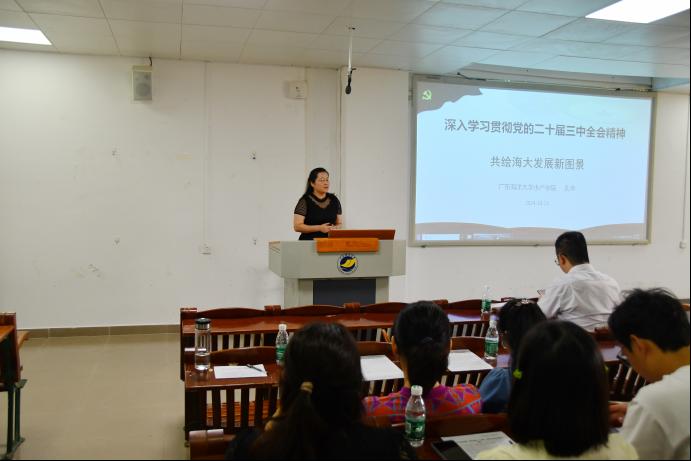 于2024年10月23日在明德楼A座103报告厅召开党的二十届三中全会精神宣讲会,会议邀请了水产学院孔华副教授作题为《深入学习贯彻党的二十届三中全会精神共绘海大发展新图景》的宣讲。会议由彭小红院长主持,学院140多位教师参加会议。