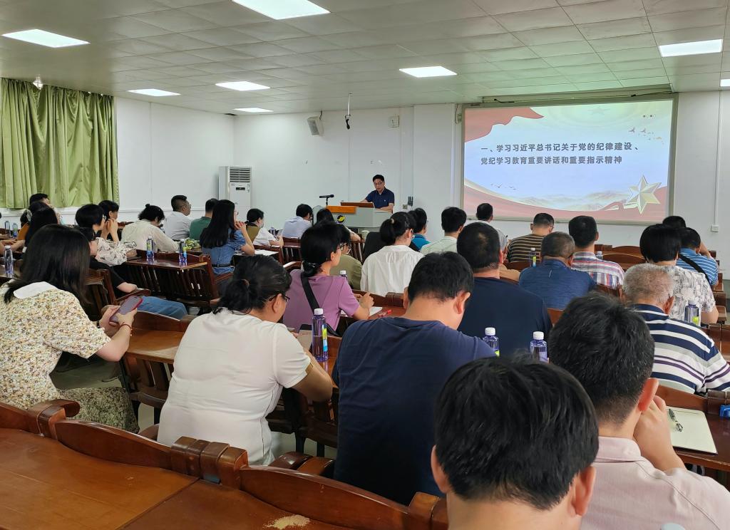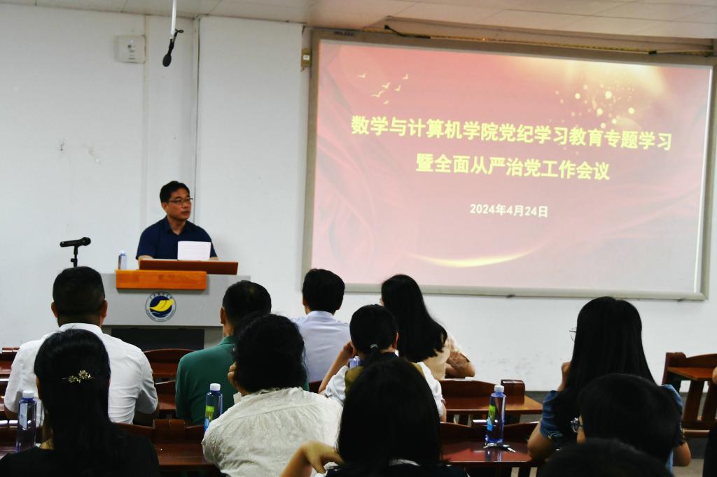 在明德楼A103报告厅召开党纪学习教育专题学习暨2024年全面从严治党工作会议。学院全体领导干部、教师党员参加学习,学院党委书记龙俊以《学纪 知纪 明纪 守纪》为题作专题报告。