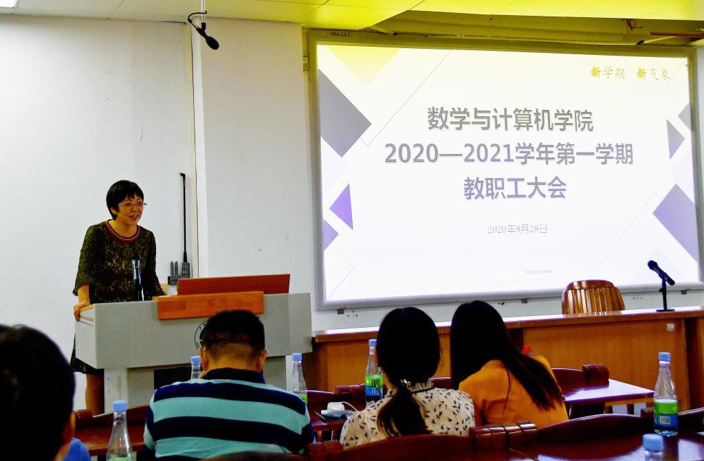 彭小红在会议上,首先总结了上学期和暑假完成的主要工作,充分肯定了全体教职工在疫情期间圆满完成教学任务以及在计算机科学与技术硕士点专项评估、专业认证、项目申报、教书育人等方面所取得的成绩。然后对新学期的工作重点、工作方向、工作目标和工作举措进行了布置和谋划,重点介绍了学院今后在人才引进、科研平台建设、一流专业和一流课程建设、专业认证、教学团队建设等方面的规划和要求。并特别强调全院上下要高度重视秋季入学工作,做好新学期师生返校的疫情防控工作。