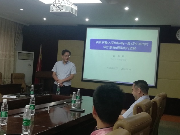王其如教授介绍了一类具有输入项和标准(一般)发生率的时滞扩散SIR模型的行波解。王教授首先介绍了行波解的研究现状,然后详细的讲解了行波解的存在性、渐近性质、不存在性。最后,介绍了具有一般发生率系统的行波解。