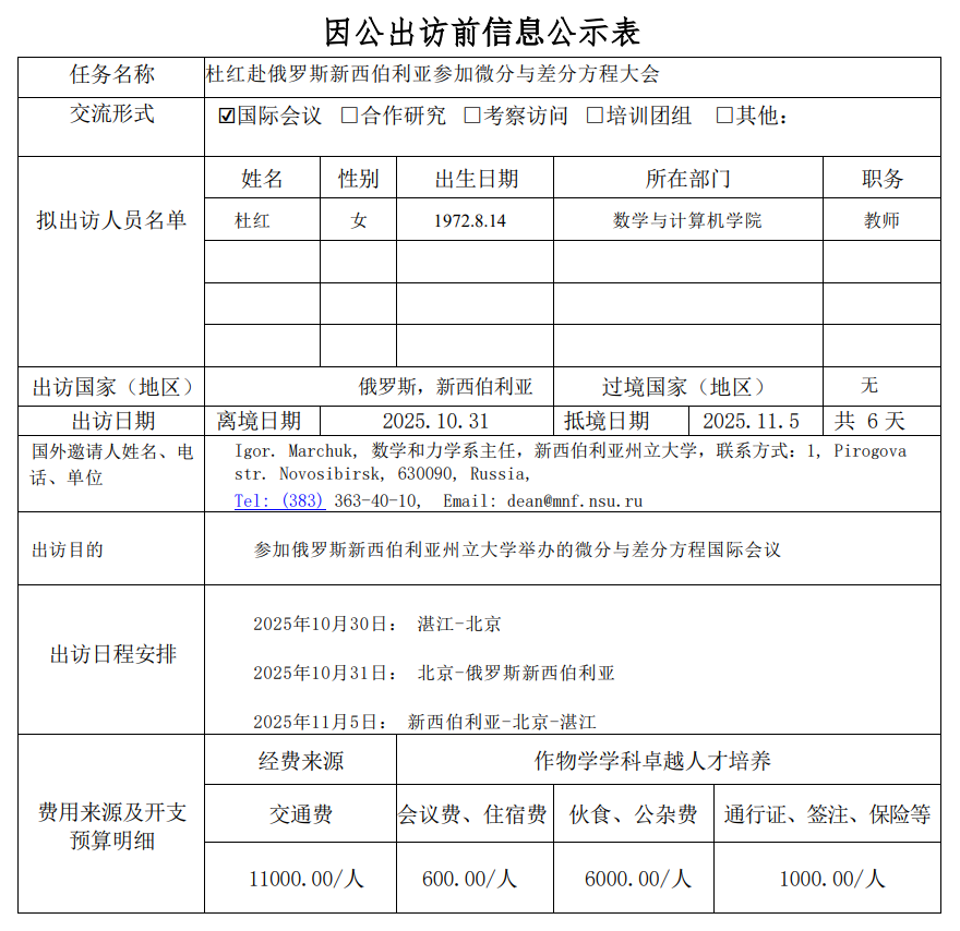 根据《关于进一步规范省部级以下国家工作人员因公临时出国的意见》的要求,现将杜红同志因公出访前信息予以公示(详见附表),公示时间为2025年9月22日至2025年9月26日。如有意见,请于公示期间向学院反映。