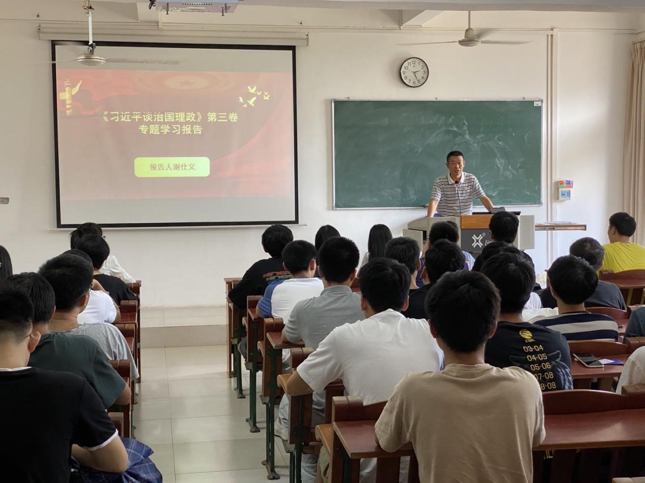 党委书记谢仕义教授从《习近平谈治国理政》第三卷出版的重大意义、主要内容和如何学习贯彻落实书中习近平新时代中国特色社会主义思想等三方面,为学生讲授了一堂生动的思政课。他号召全体学生大力弘扬理论联系实际的优良学风,学深悟透《习近平谈治国理政》第三卷,呼吁学生务必了解历史,不要崇洋媚外,坚持道路、文化、理论、制度自信,一切从实际出发,不忘初心、牢记使命。同时对学生提出三个要求:一要真情实感读原著;二要真心实意学原文;三要真下功夫悟原理。告诉学生应反复阅读这部重要著作,要做到“知其然更知其所以然”。